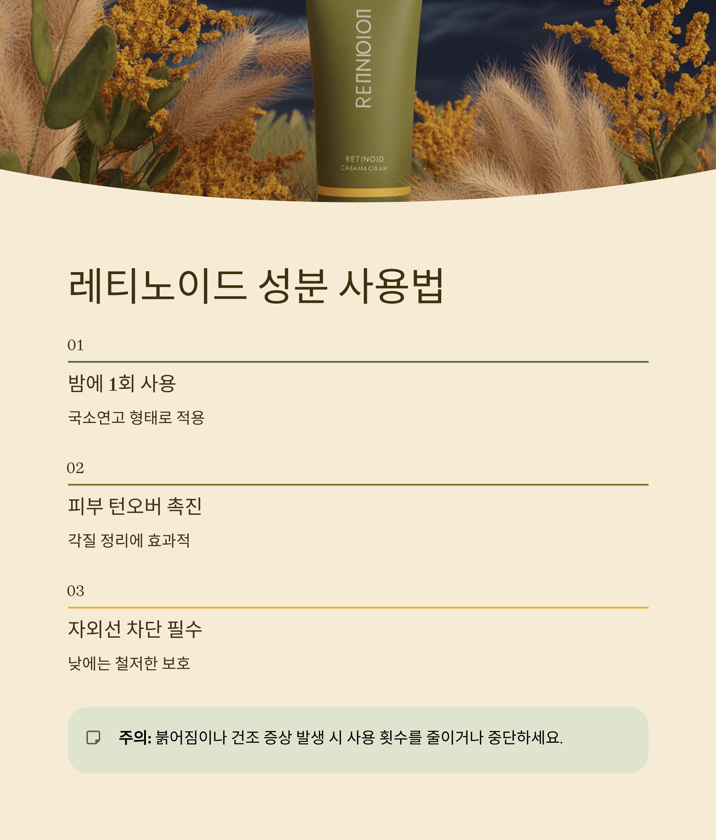 다만 레티노이드는 피부 자극이 강할 수 있어, 낮에는 자외선 차단을 철저히 하고 사용 후 붉어짐이나 건조 증상이 있을 경우 횟수를 줄이거나 중단해야 합니다.