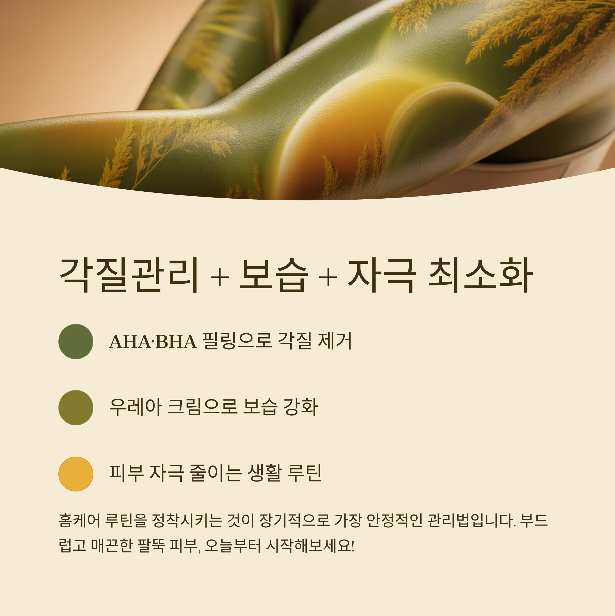 피부과 시술도 방법이 될 수 있지만, 홈케어 루틴을 정착시키는 것이 장기적으로 봤을 때 훨씬 안정적인 관리법이 될 수 있습니다. 부드럽고 매끈한 팔뚝 피부, 어렵지 않아요. 오늘부터 천천히 시작해보세요!