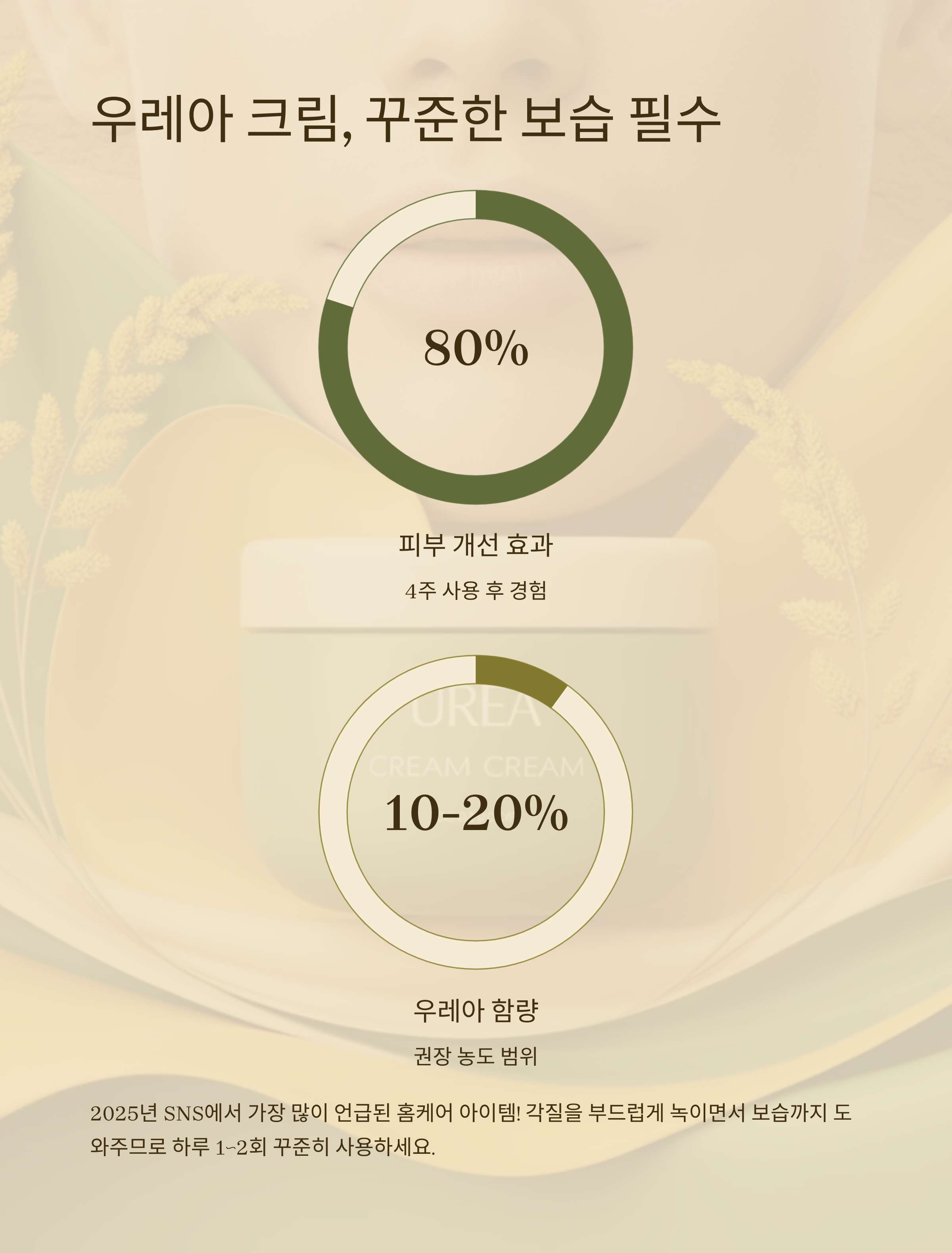 2025년 SNS 리뷰에서 가장 많이 언급된 홈케어 아이템은 바로 우레아(Urea) 10% 이상 함유된 크림입니다. 실제로 미국 피부과학회 자료에 따르면, 우레아 10~20% 제품을 4주간 사용했을 때 사용자 중 80% 이상이 피부 개선 효과를 경험했다고 보고됩니다.