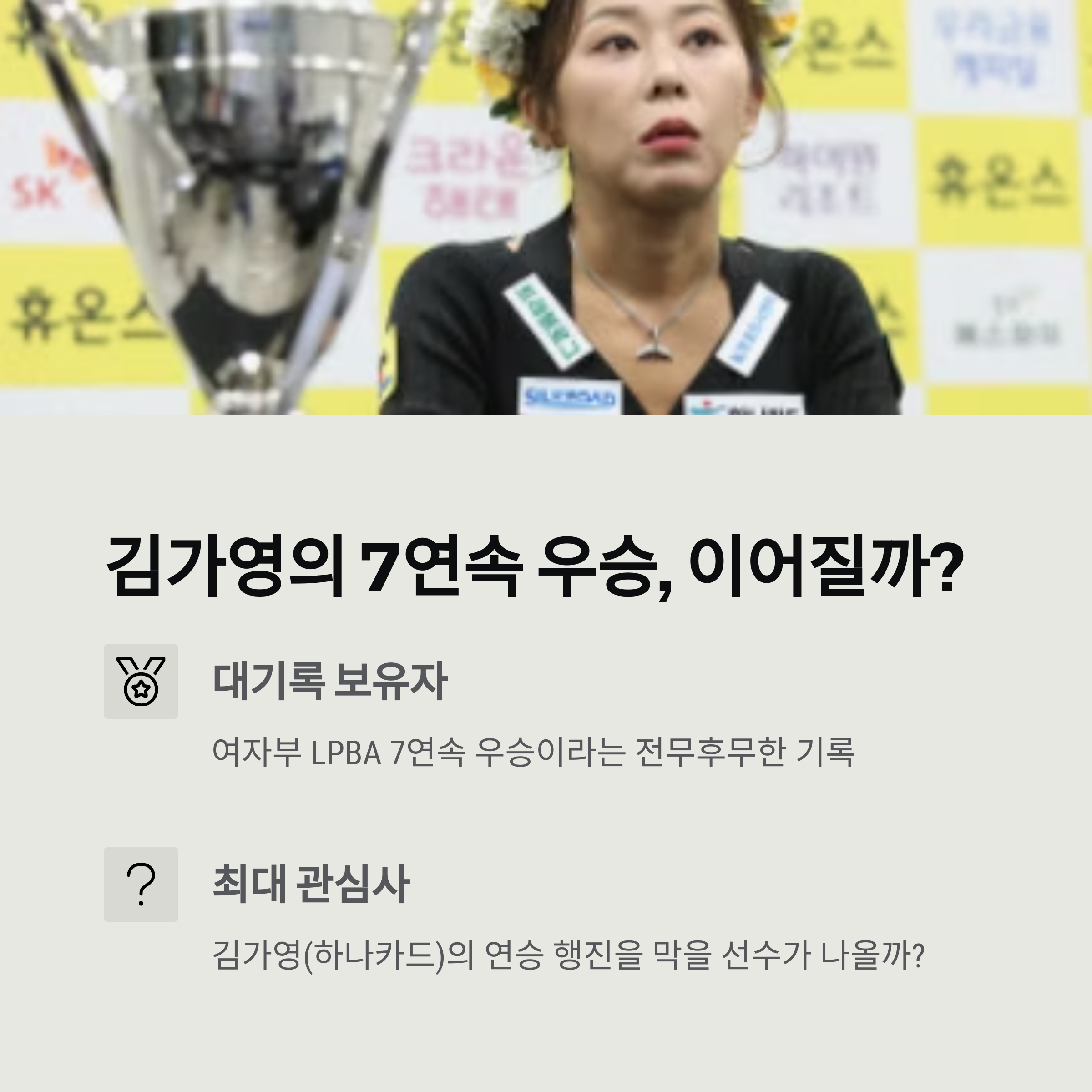 "김가영의 연승 행진을 막을 선수가 나올까?"는 이번 시즌 가장 큰 관심사 중 하나입니다