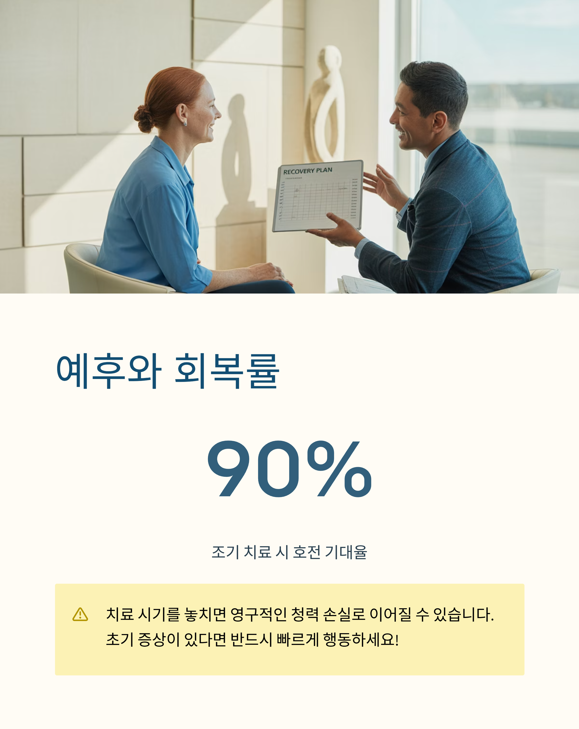돌발성 난청은 조기에 대응하면 90% 이상의 호전을 기대할 수 있습니다. 하지만 치료 시기를 놓치면 영구적인 청력 손실로 이어질 수 있으니, 초기 증상이 있다면 반드시 빠르게 행동하세요.