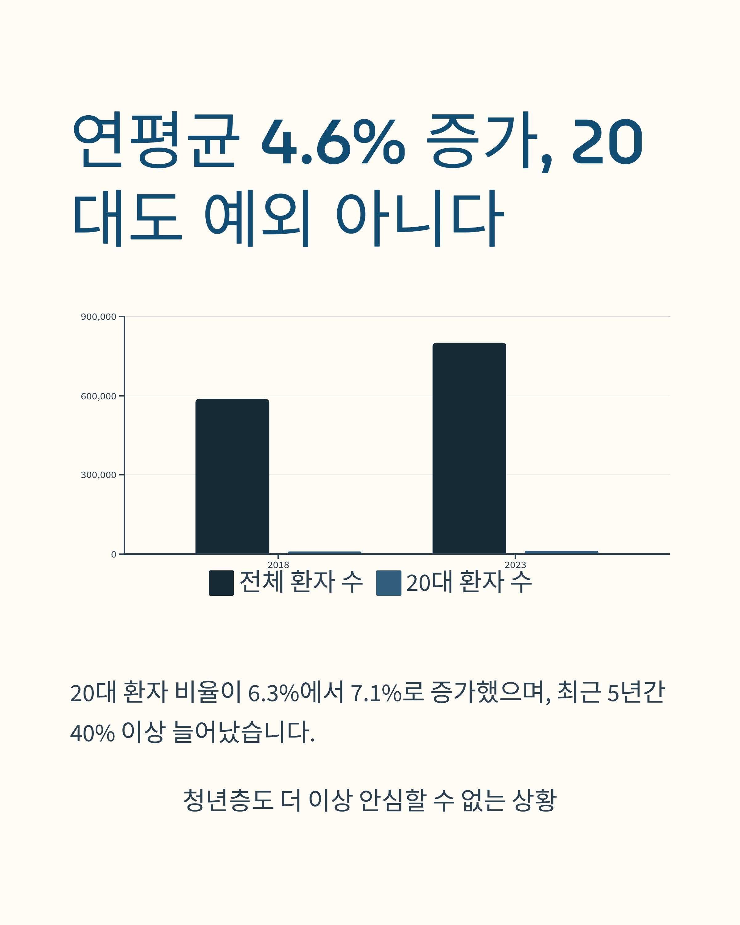 특히 20대 환자는 2019년 6.3%에서 2023년 7.1%로 증가했고, 최근 5년간 40% 이상 늘어난 것으로 나타났습니다. 청년층도 더 이상 안심할 수 없는 상황입니다.