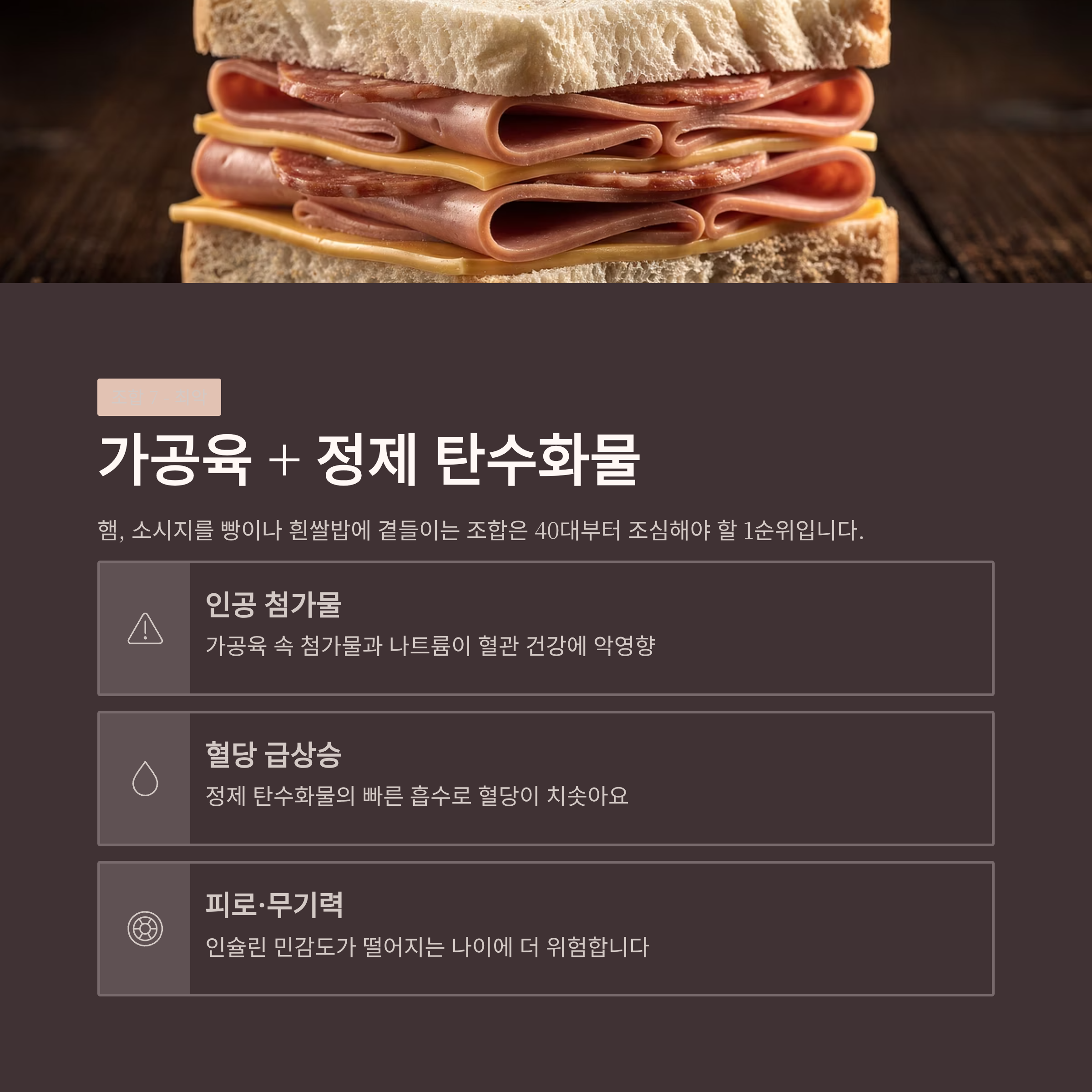햄, 소시지 등 가공육을 빵이나 흰쌀밥에 곁들이는 조합은 정말 흔하지만, 40대부터는 조심해야 할 조합 1순위입니다.