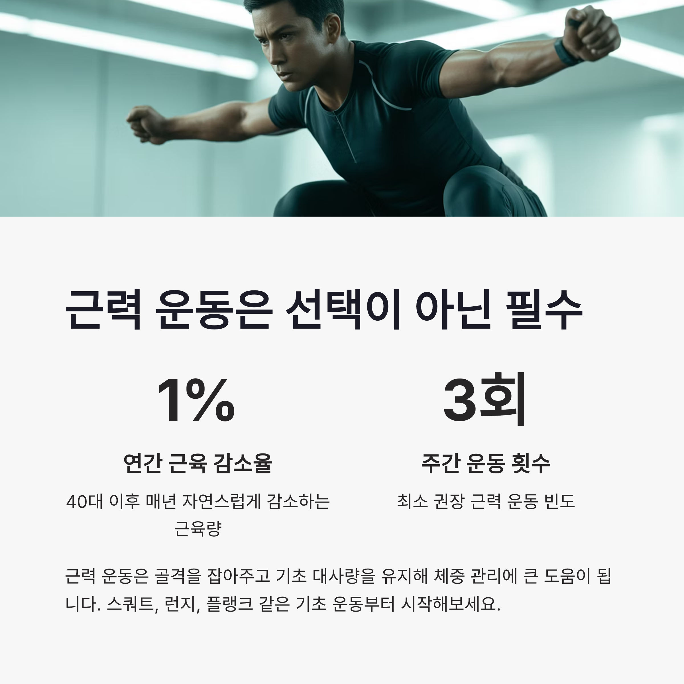 "일주일에 최소 3회, 스쿼트, 런지, 플랭크 같은 기초 운동부터 시작해보세요."