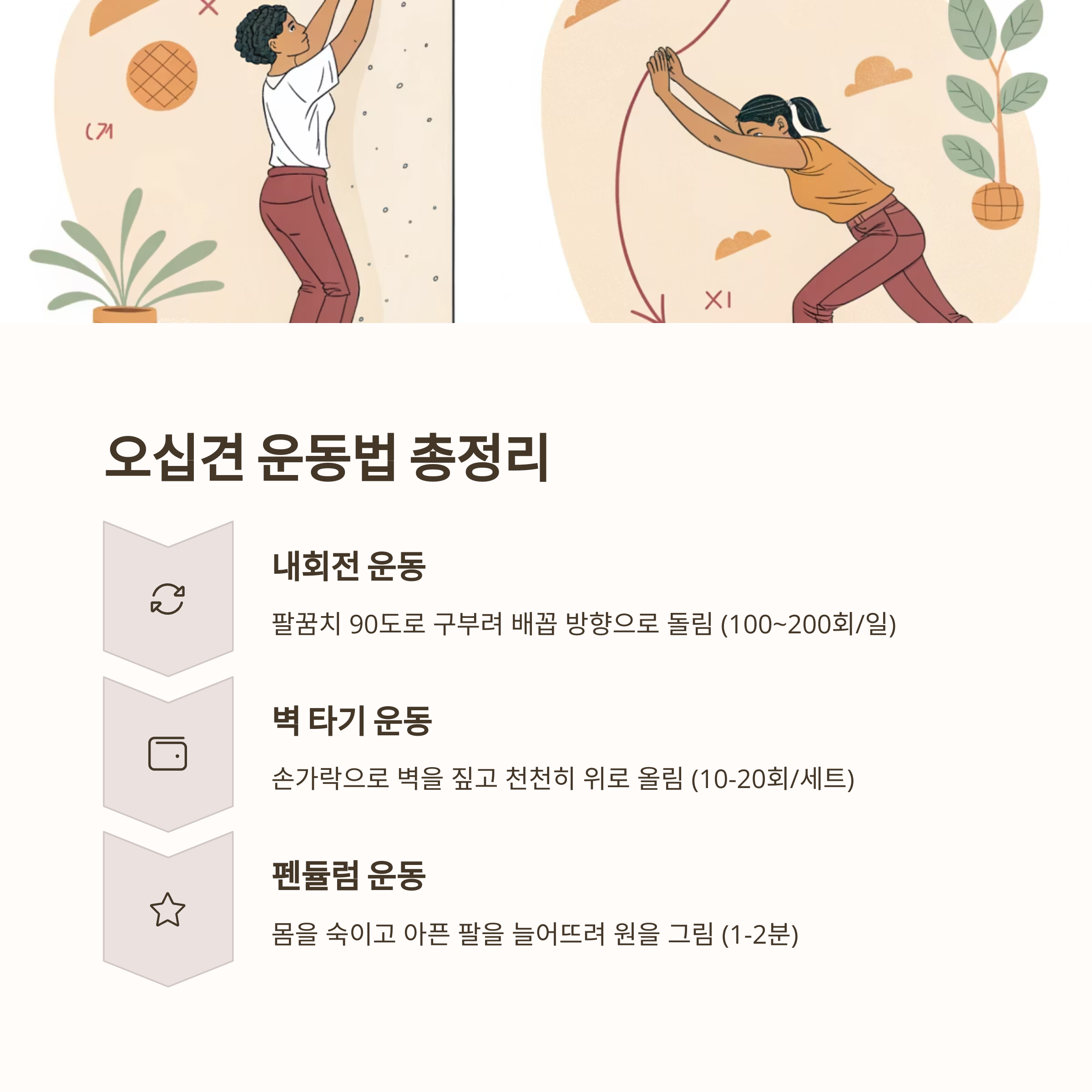 권장 운동은 하루 100회에서 200회의 팔 회전 동작, 벽 타기, 체조봉 운동 등이 있으며