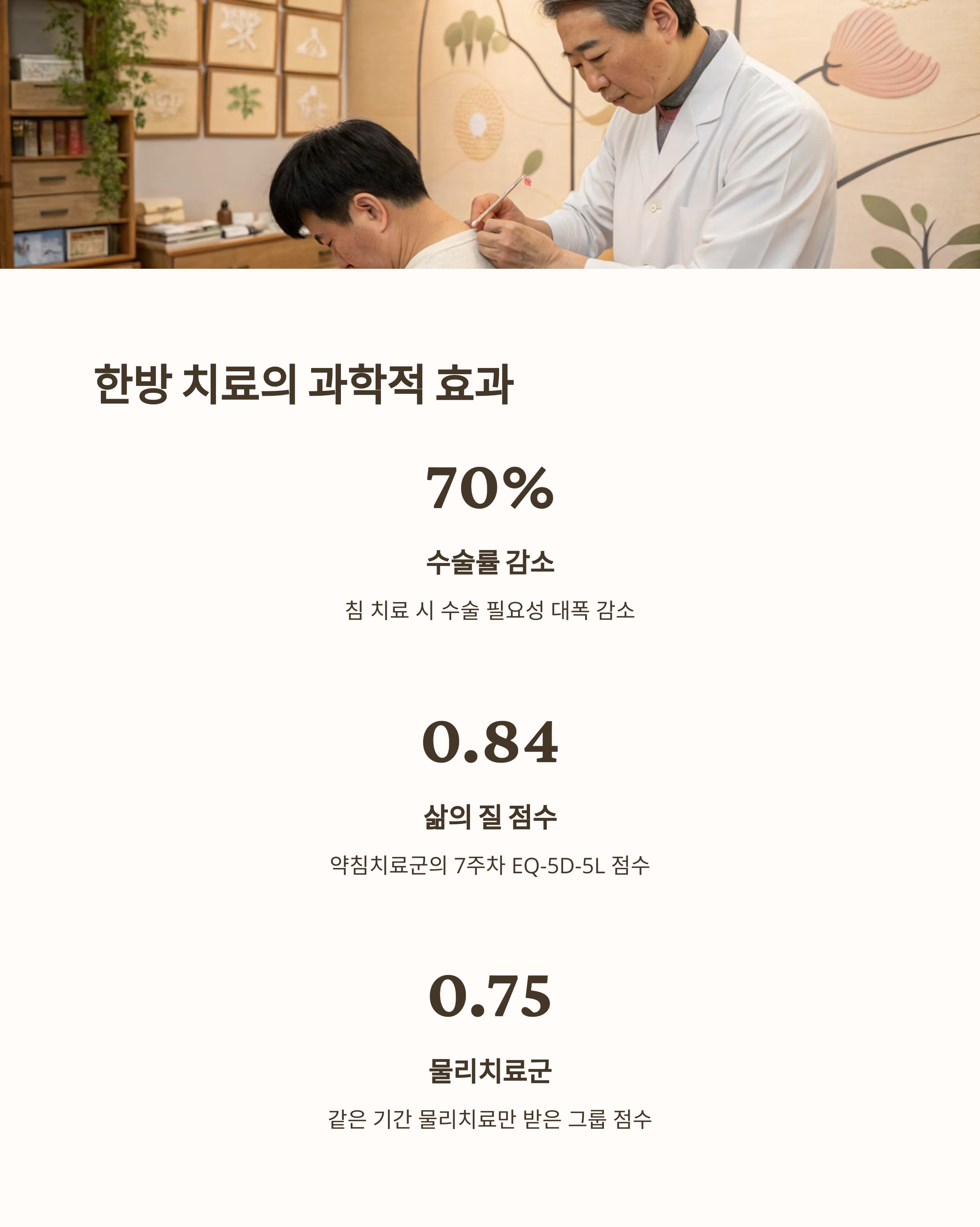 | 수술률 감소 | 침 치료 받은 환자 → 미치료군 대비 수술률 70% 이상 감소 |