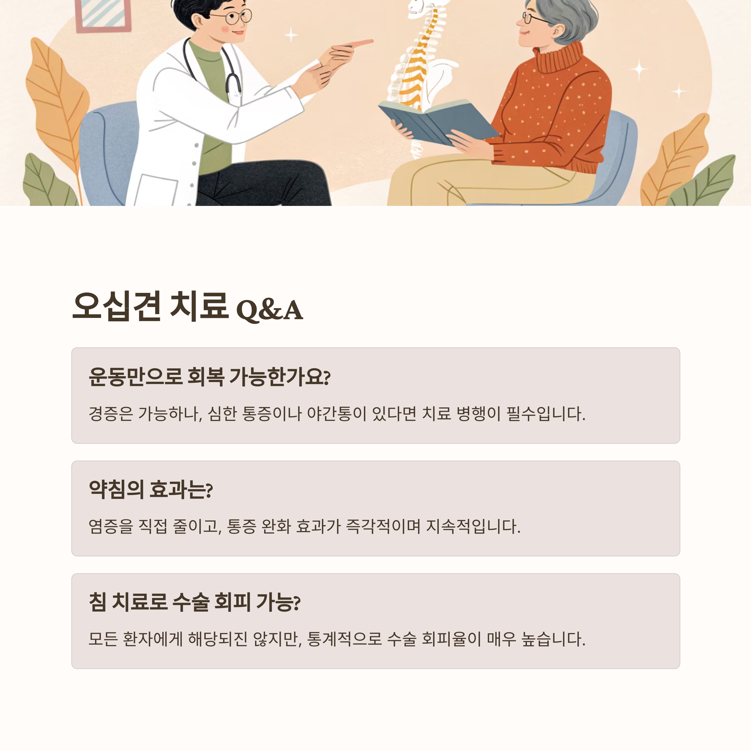 핵심: 조기 치료와 꾸준한 운동이 병행되어야만 통증 완화와 기능 회복, 수술 회피가 가능하다는 점입니다.