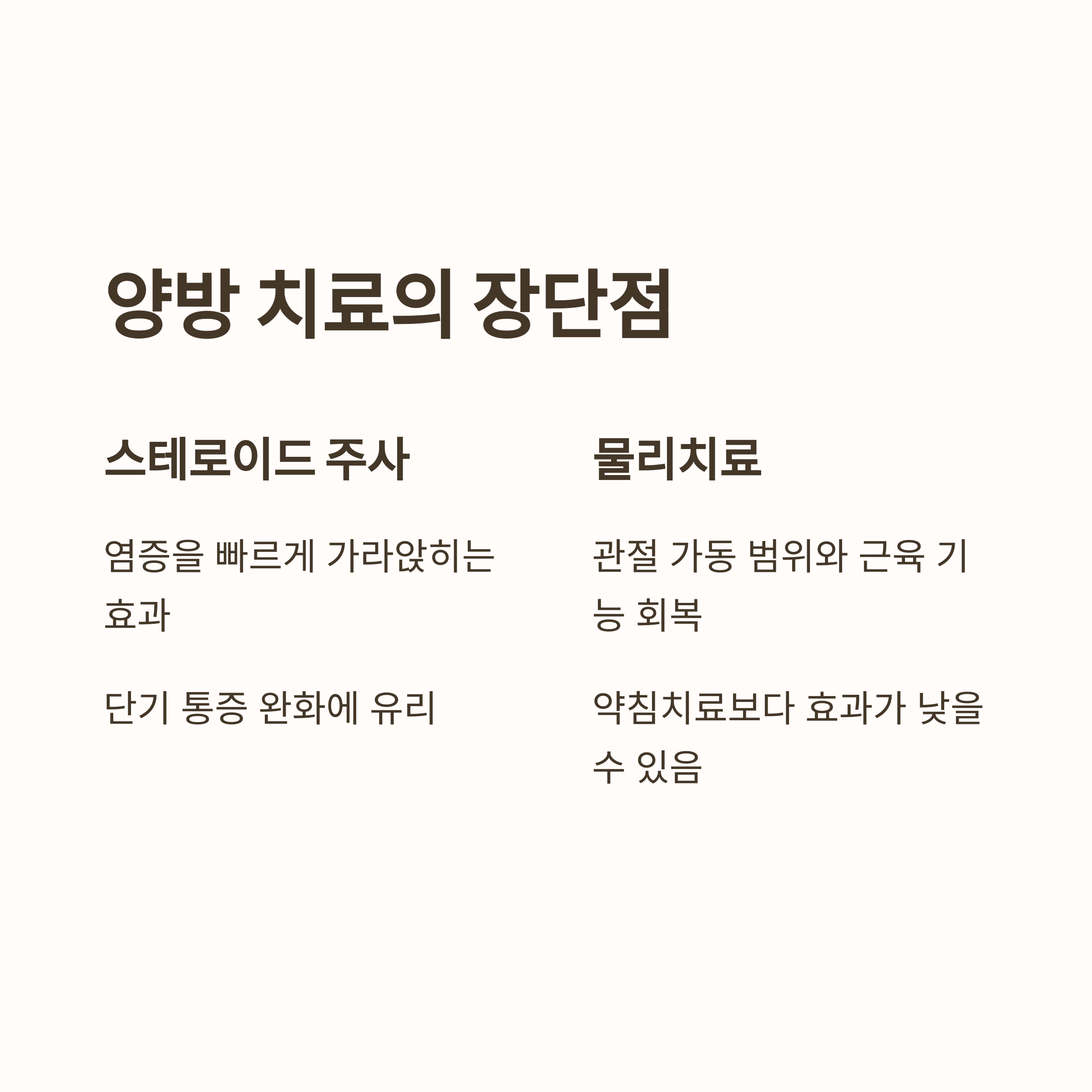 스테로이드는 염증을 빠르게 가라앉히며, 물리치료는 관절 가동 범위와 근육 기능을 회복시킵니다.