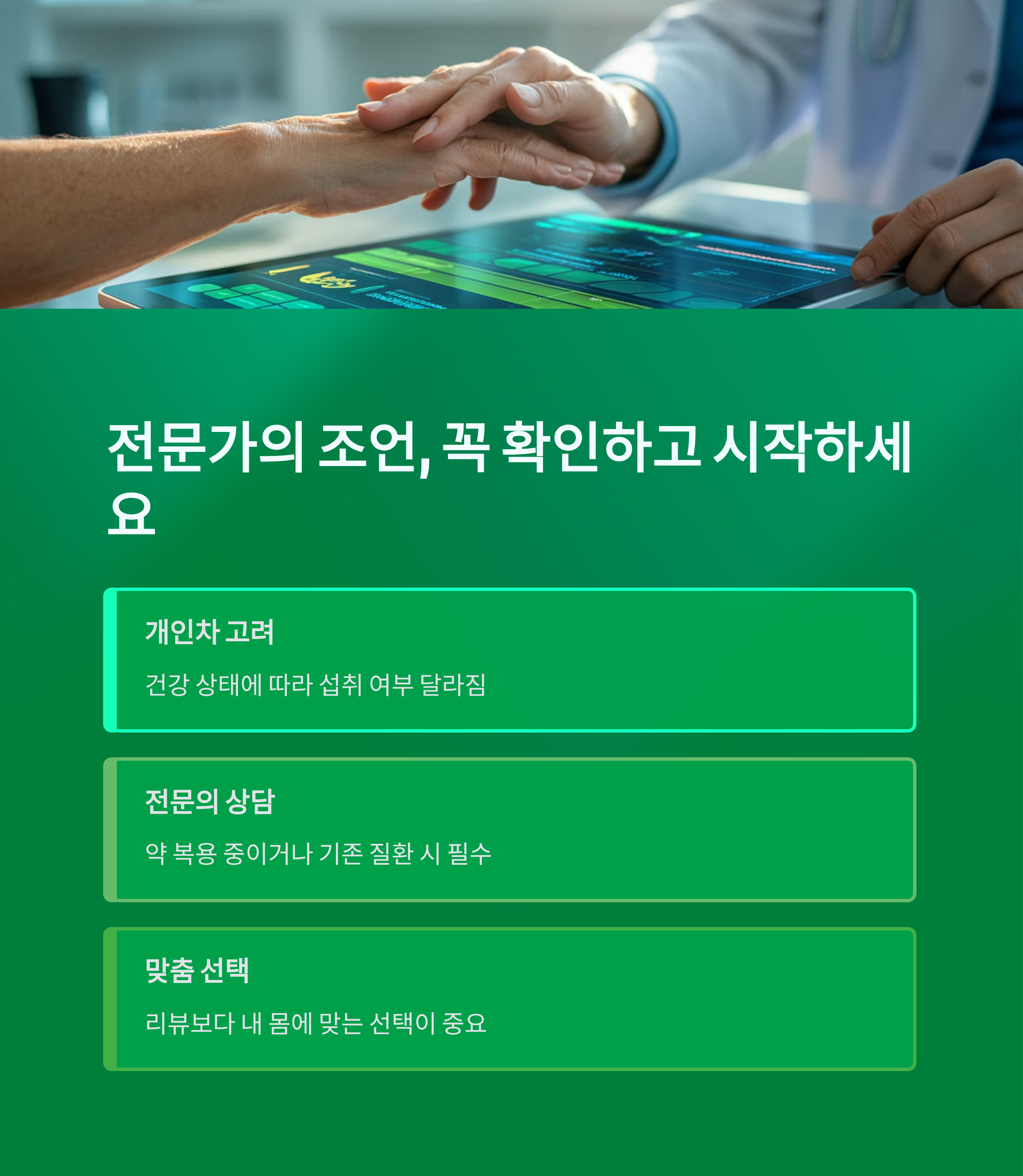 특히 약을 복용 중이거나 기존 질환이 있다면 전문의와 상담 후 복용을 시작하는 게 중요합니다.