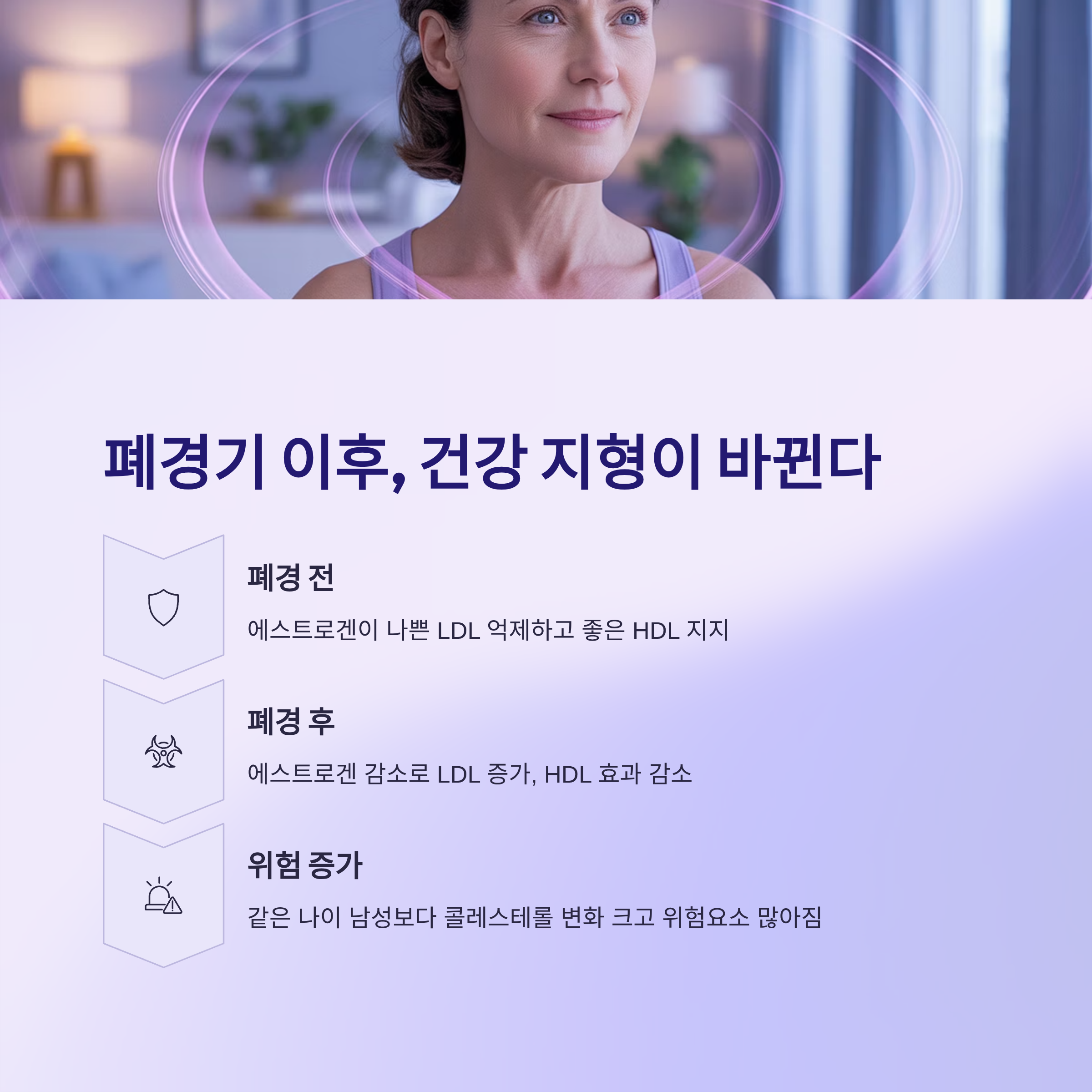 게다가 HDL도 함께 줄어들 수 있어, 이중 위험을 안고 갑니다. 즉, 중년 이후 여성의 건강 관리는 '호르몬 변화'를 꼭 고려해야 해요.
