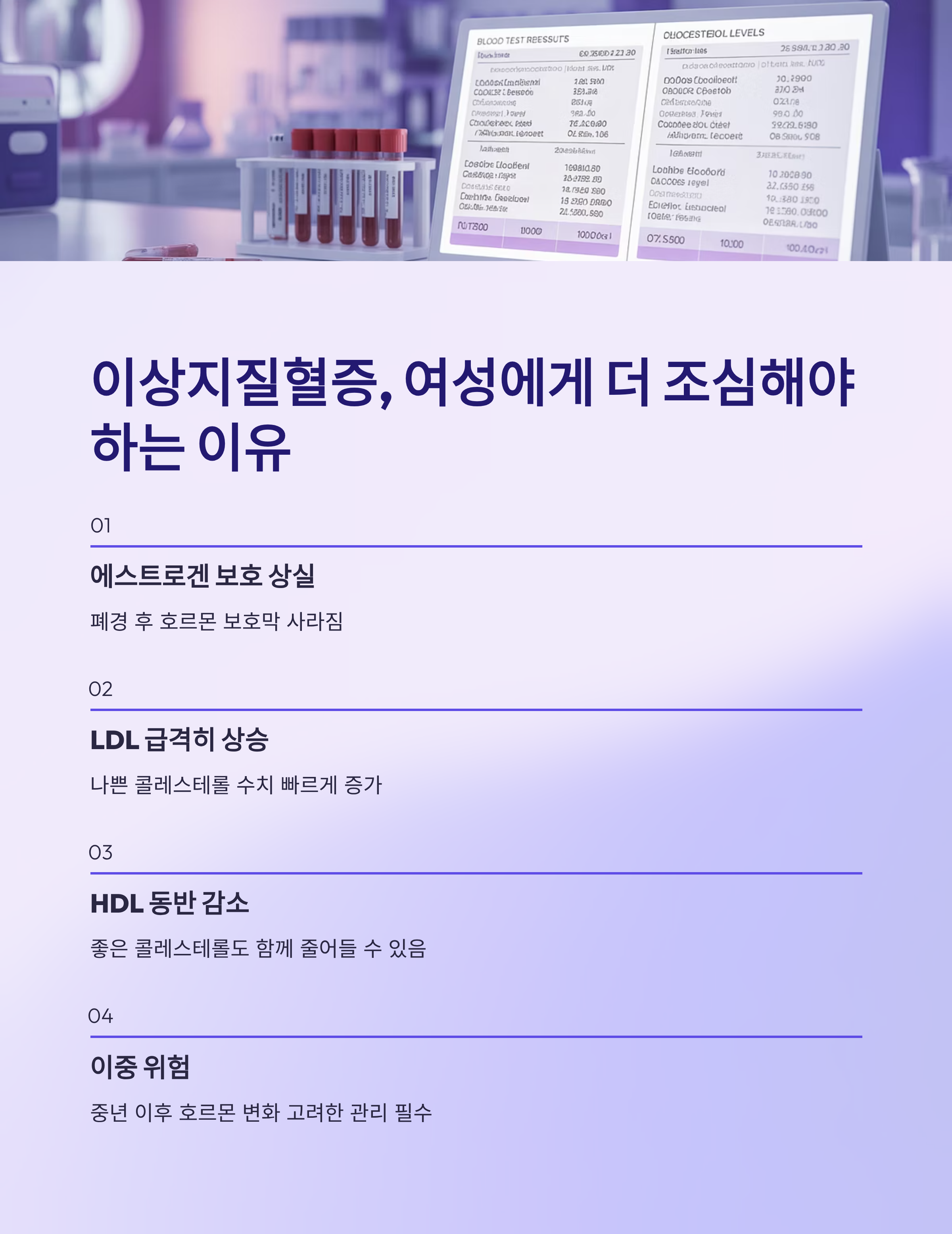 여성은 폐경 이후 이상지질혈증이 빠르게 증가합니다. 이유는 간단해요. 에스트로겐의 보호가 사라지고, LDL 수치가 급격히 올라가기 때문입니다.