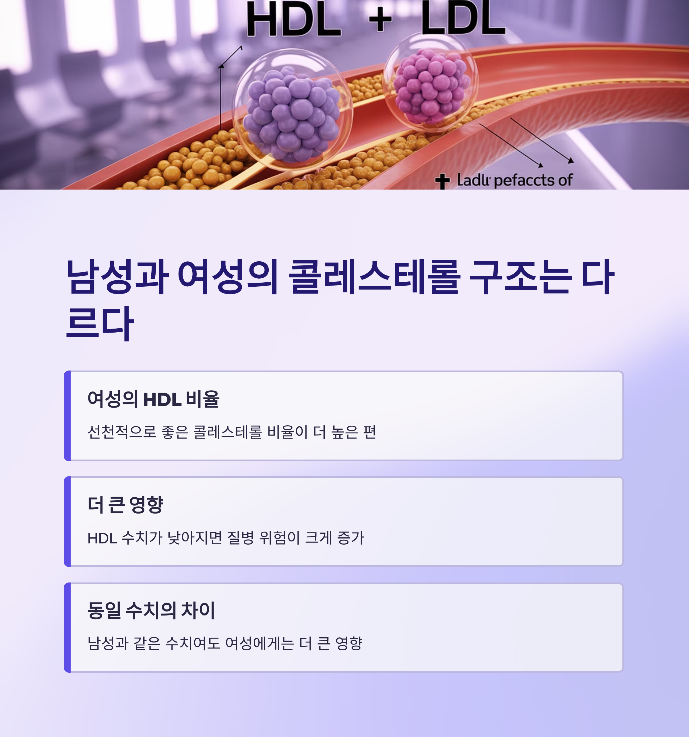 하지만 이는 '더 건강하다'는 뜻이 아니에요. 오히려 여성은 HDL 수치가 기준보다 낮아지거나 분해율이 높아지면 그 자체로 질병 위험이 커집니다. 남성과 동일한 콜레스테롤 수치를 가져도, 여성에게는 더 큰 영향을 미치는 셈이죠.