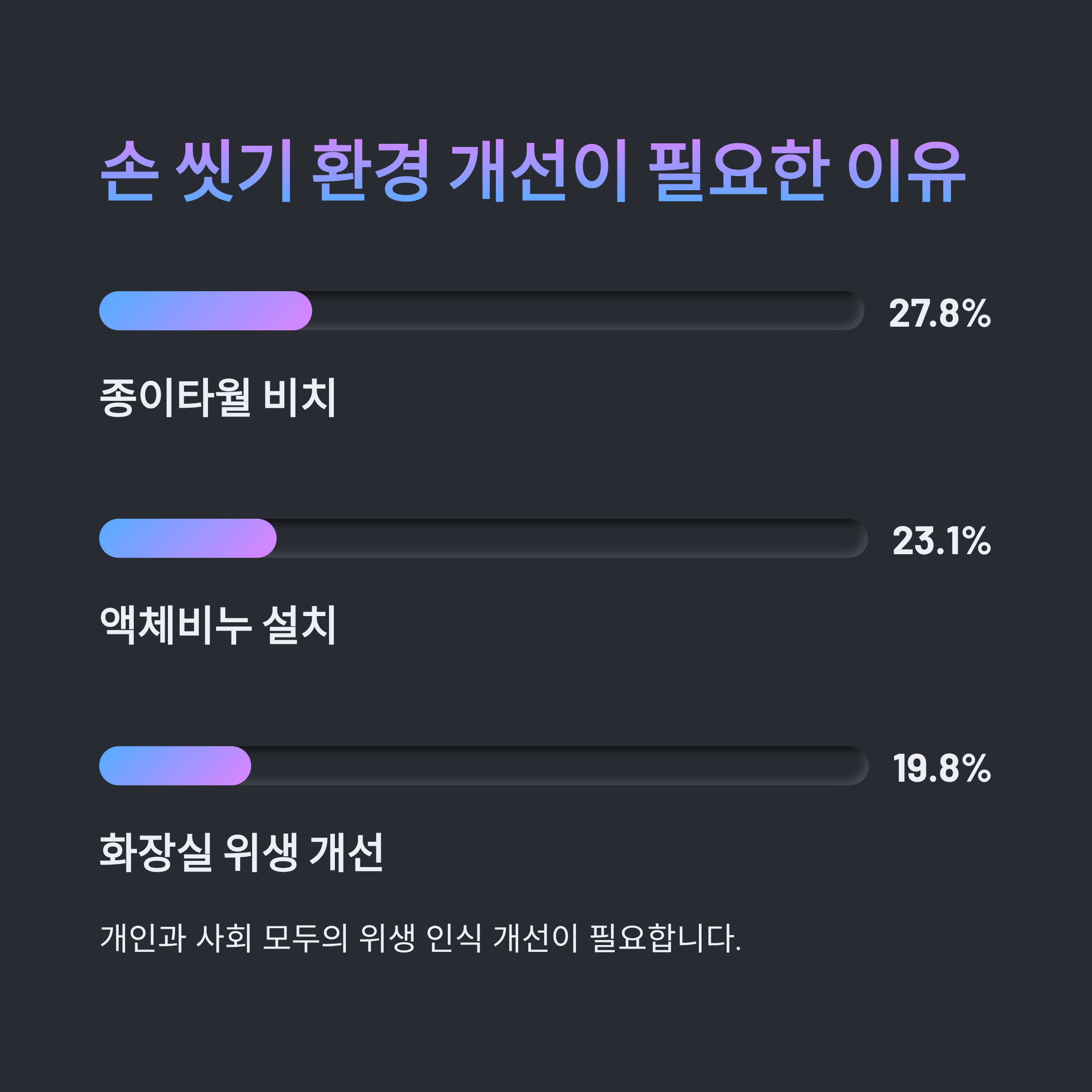 화장실 위생 상태 개선(19.8%)이 손 씻기 실천율 향상에 큰 도움이 되는 것으로 나타났습니다.