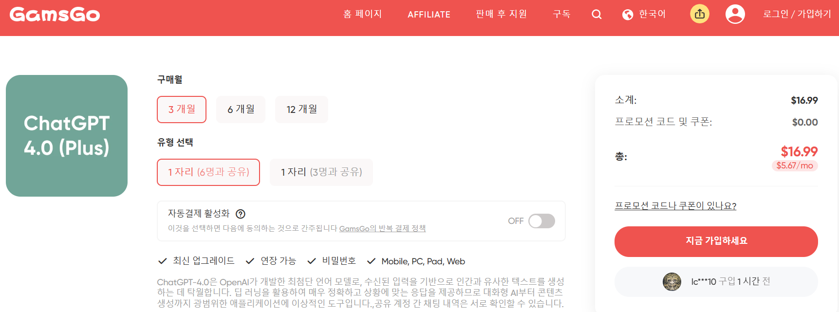 GamsGo는 ChatGPT Plus를 공식 요금보다 최대 70% 이상 저렴하게 제공하지만, 여러 사용자가 계정을 공유하기 때문에 속도와 안정성 면에서 다소 차이가 있을 수 있습니다.