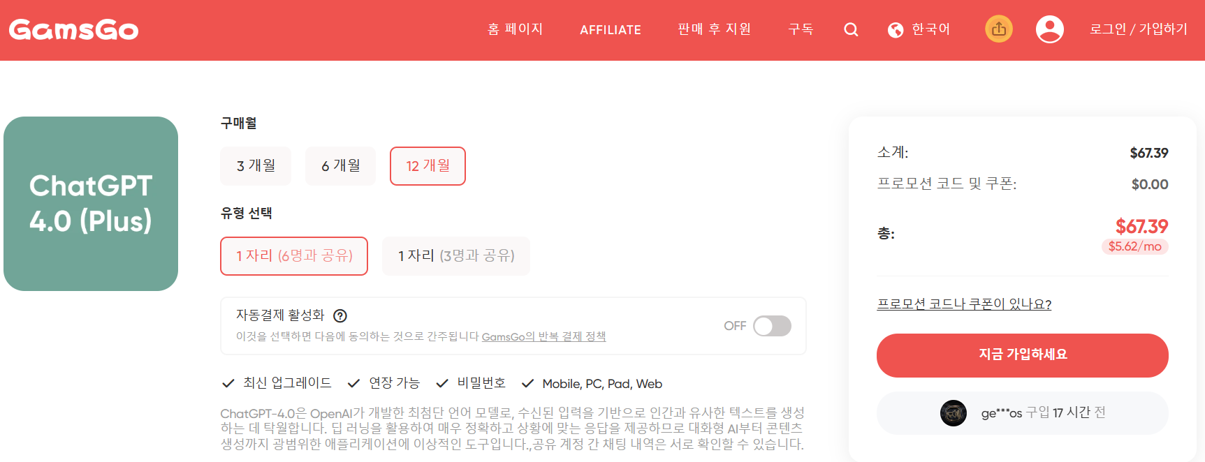 하지만 GamsGo는 같은 ChatGPT Plus 기능을 훨씬 저렴한 가격에 경험할 수 있는 매력적인 대안이랍니다!