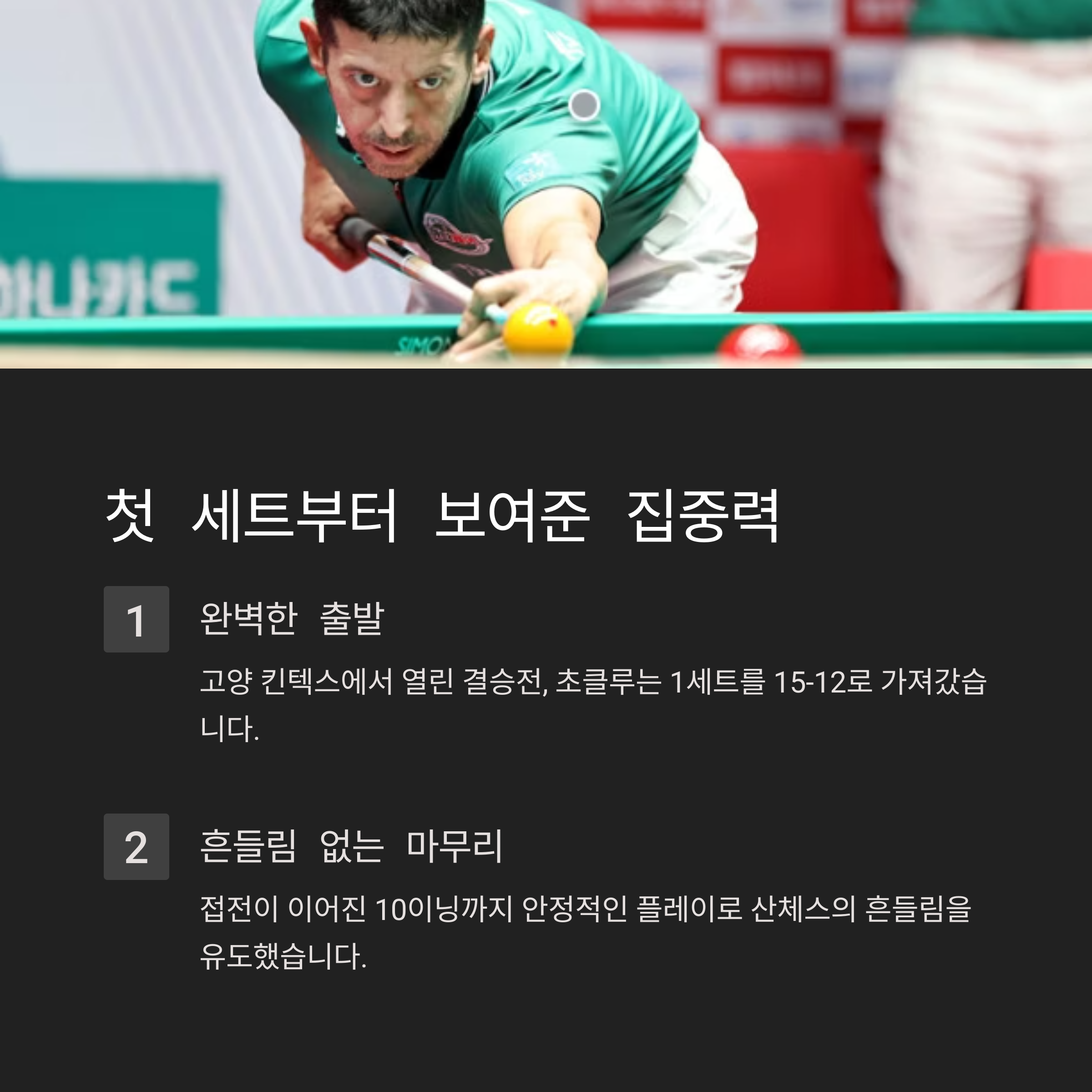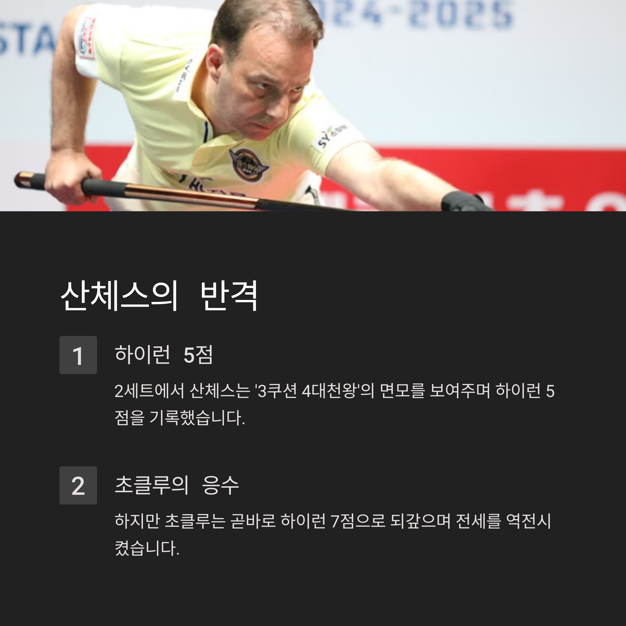 초클루는 3세트에서도 전술적으로 짜임새 있는 경기를 이어가며 15-8로 승리했습니다. 산체스는 이닝 수를 줄이기 위해 빠른 득점을 노렸지만, 초클루의 안정적인 방어와 득점 전략에 밀리는 모습이었습니다.
