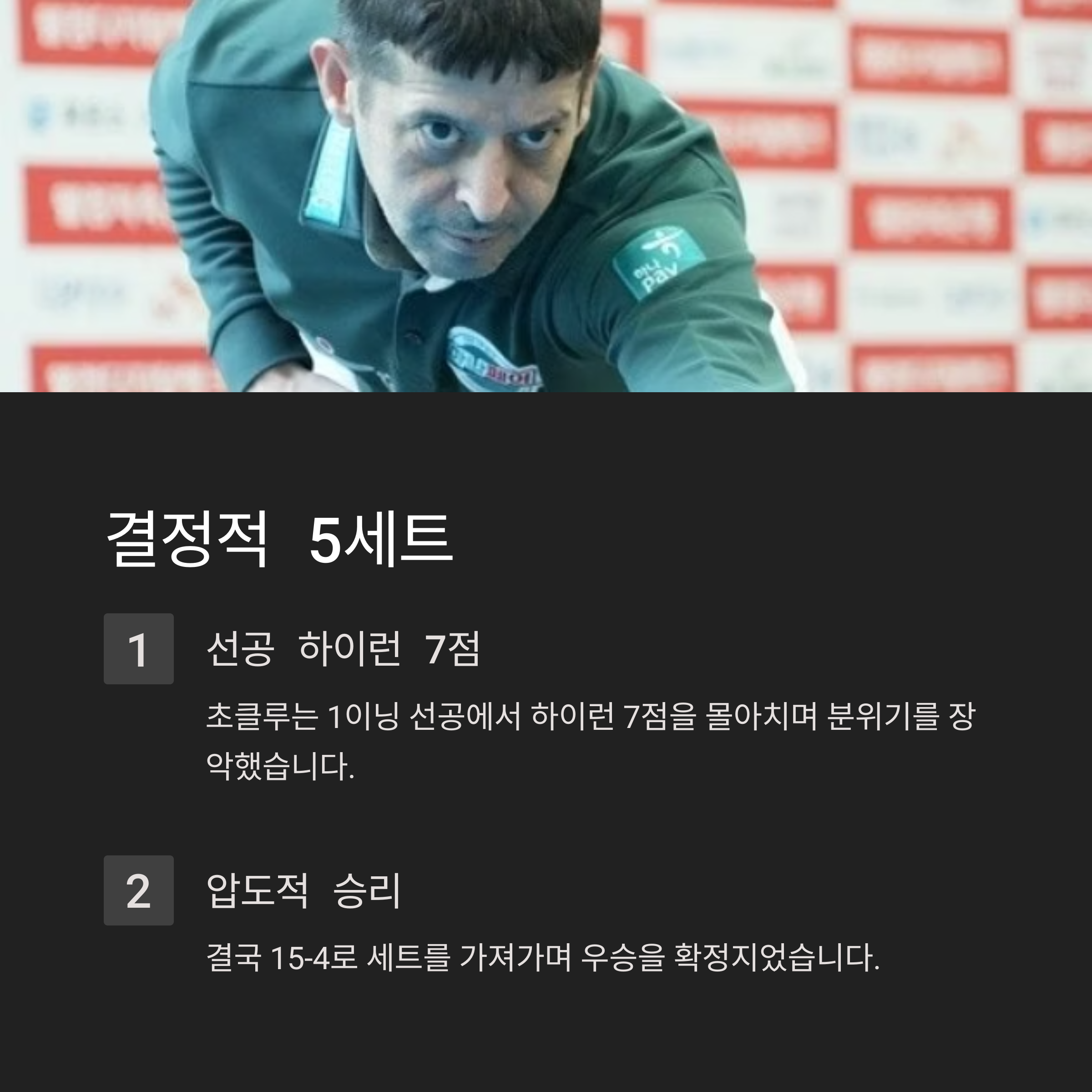 초클루는 3세트에서도 전술적으로 짜임새 있는 경기를 이어가며 15-8로 승리했습니다. 산체스는 이닝 수를 줄이기 위해 빠른 득점을 노렸지만, 초클루의 안정적인 방어와 득점 전략에 밀리는 모습이었습니다.