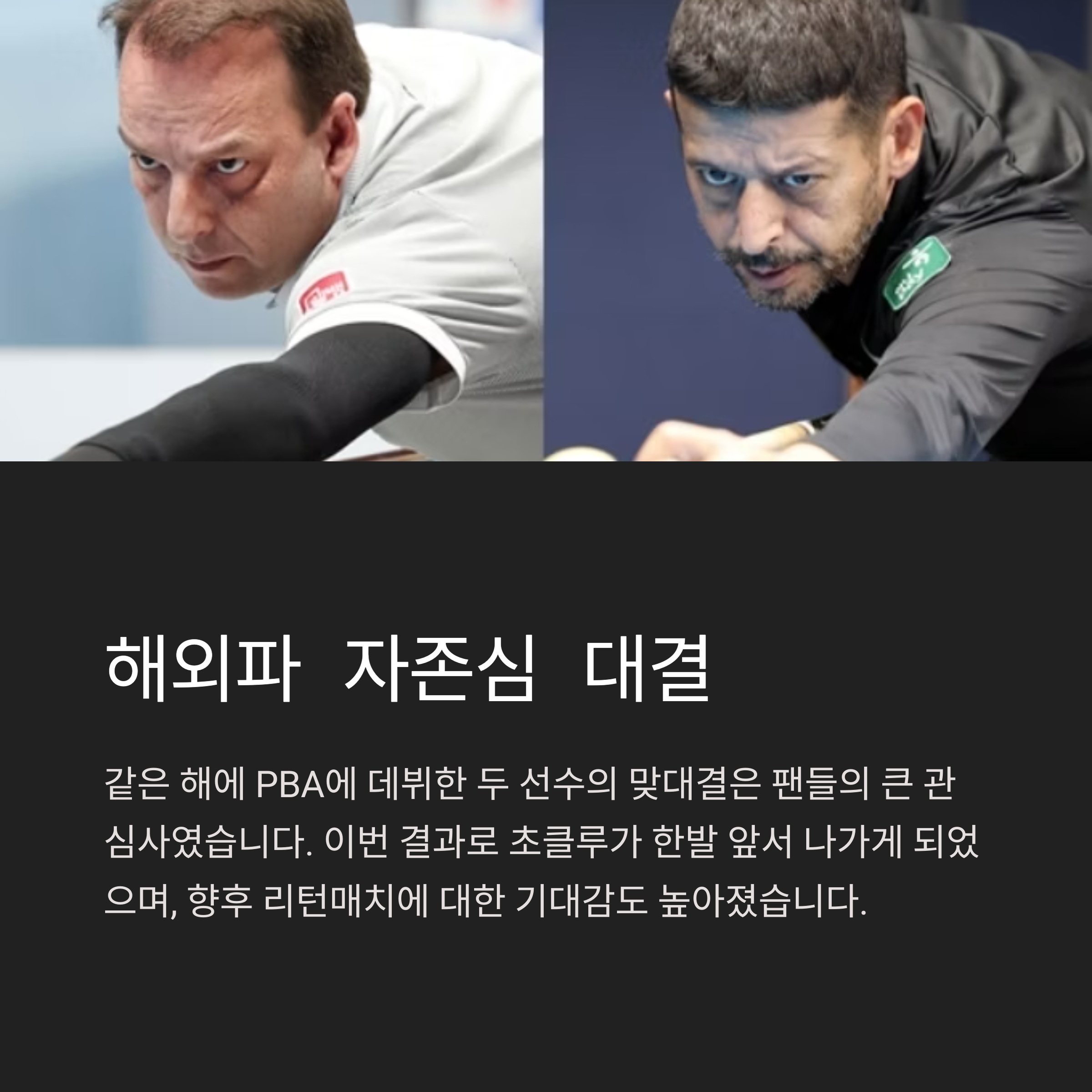 이번 우승은 초클루가 2023-2024 시즌 9차 투어 우승 이후 477일 만에 이뤄낸 성과로, PBA 무대에서의 입지를 다시 한 번 확고히 했습니다. 특히 산체스와의 첫 맞대결에서 승리하며 경쟁 구도 속에서 새로운 강자로 떠올랐다는 점에서 더 의미 있는 기록입니다.