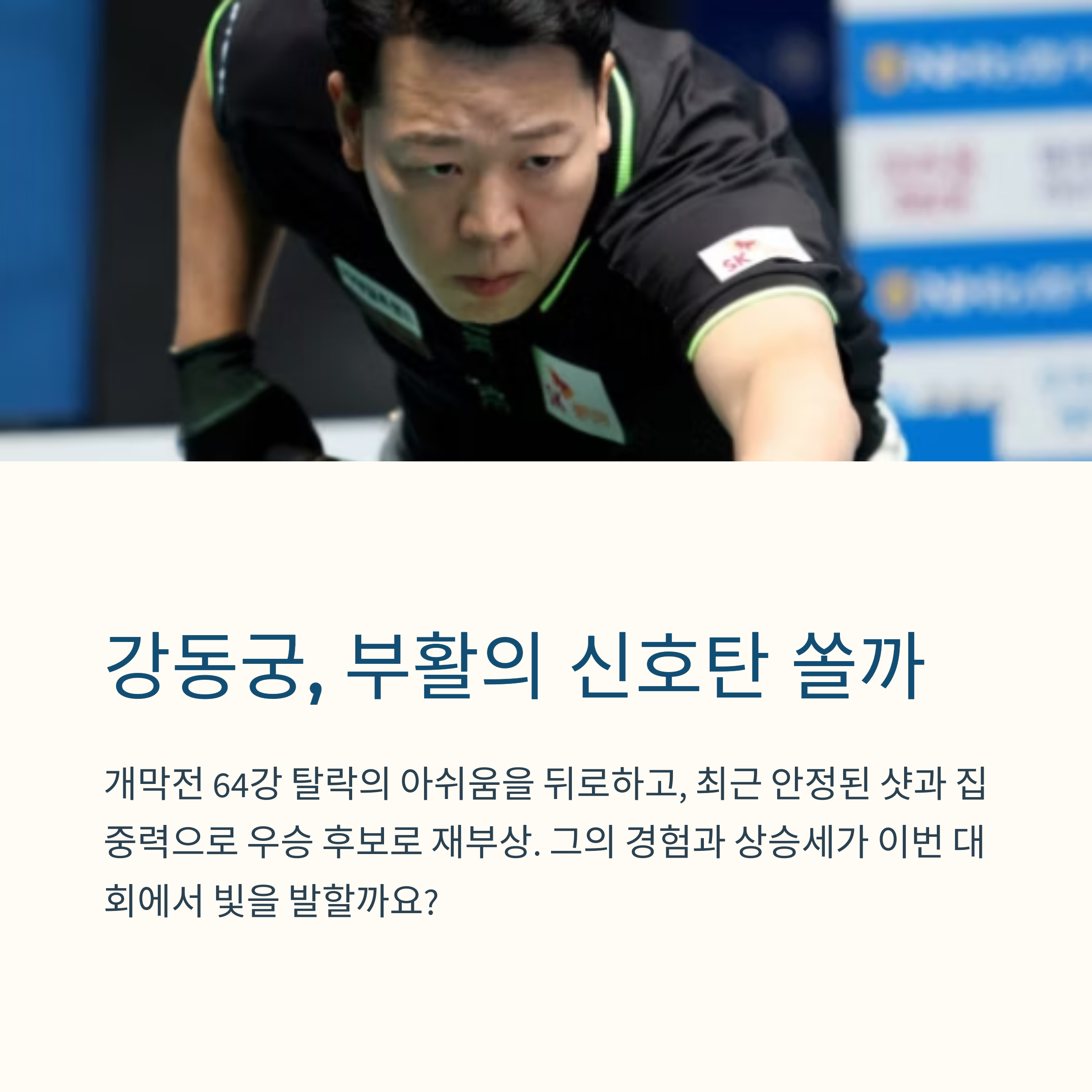 강동궁은 개막전에서 아쉽게 64강에서 탈락했지만, 최근 몇 대회에서