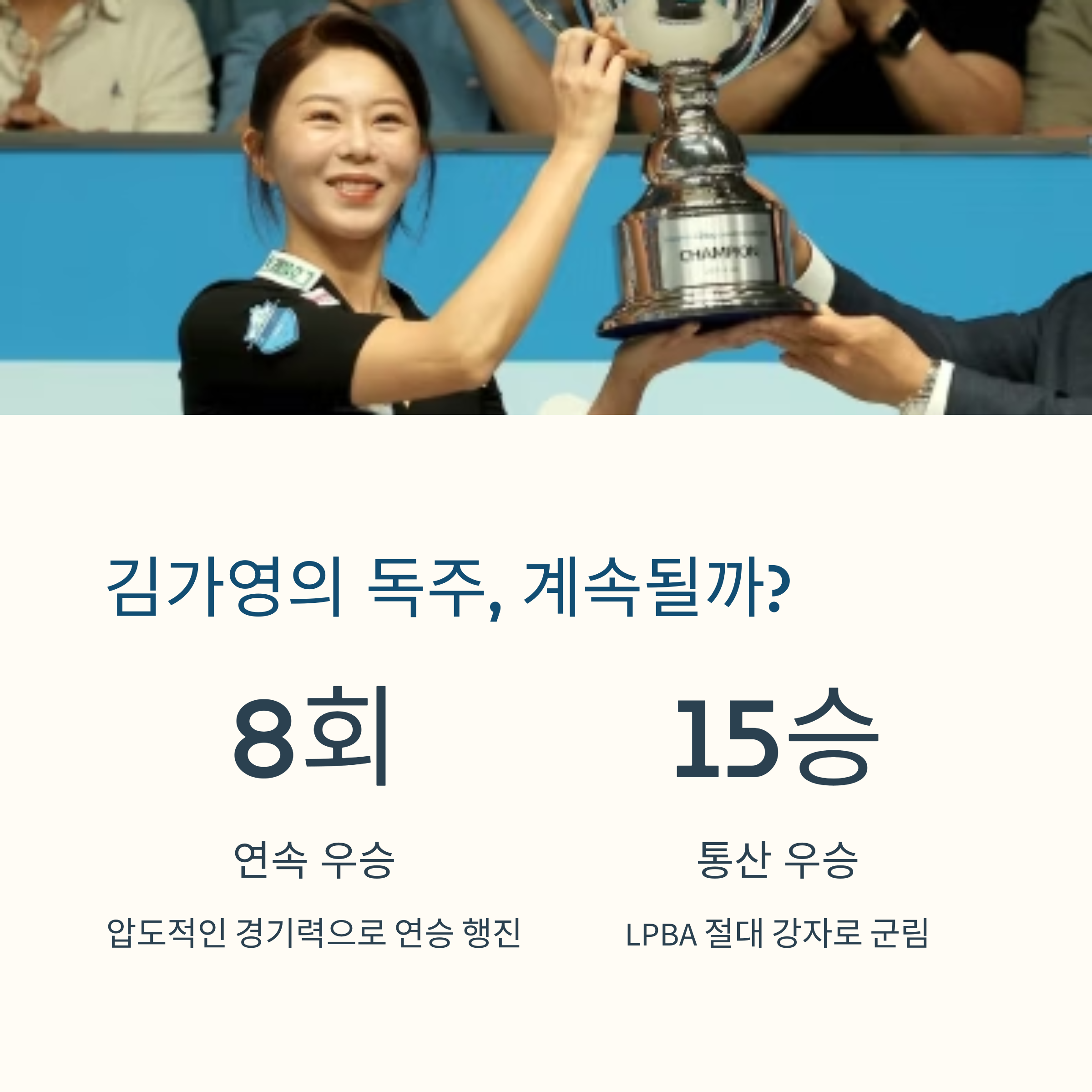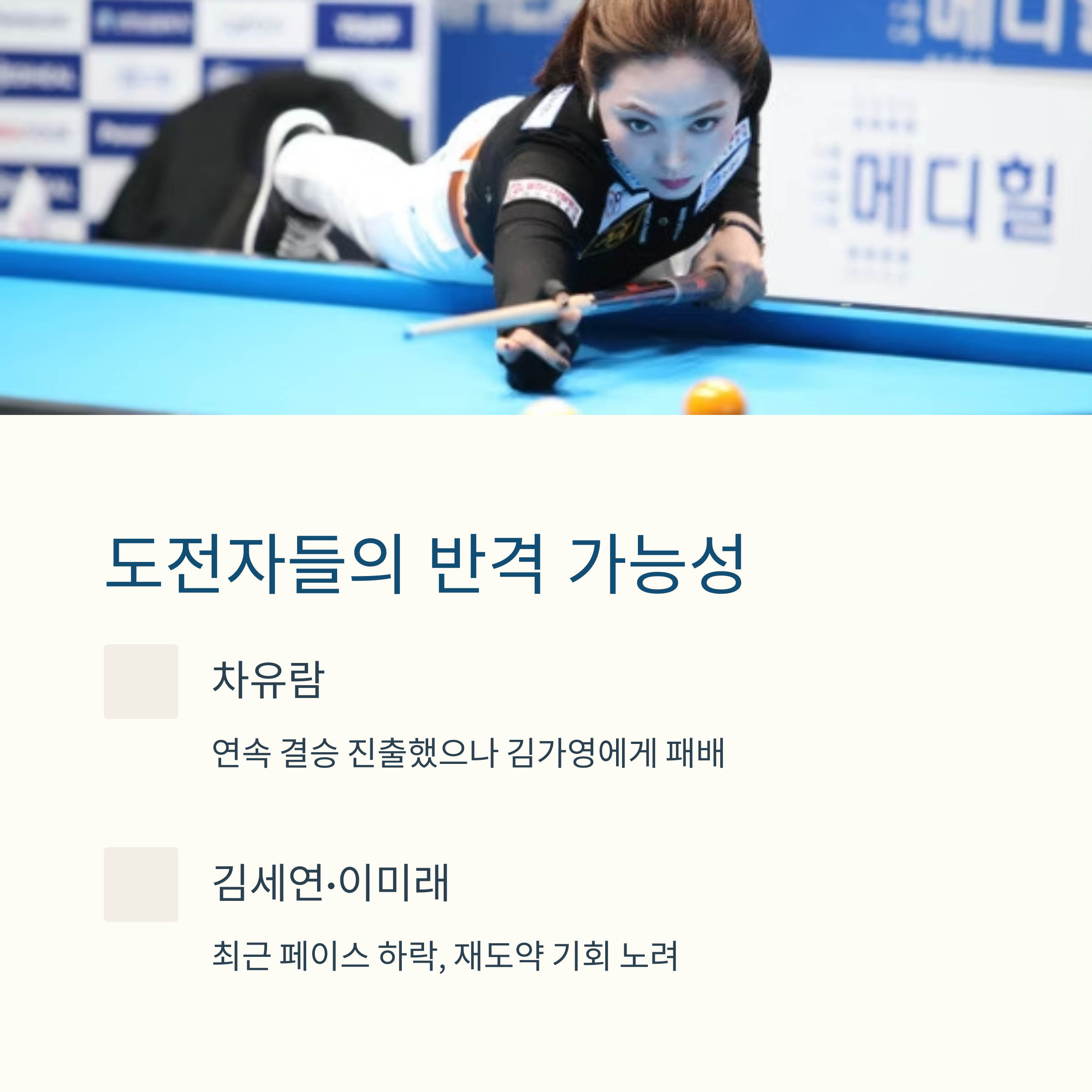 | 여자부 | 김가영 독주 체제 | 도전자들의 반격, 우승 연승 저지 가능성 |