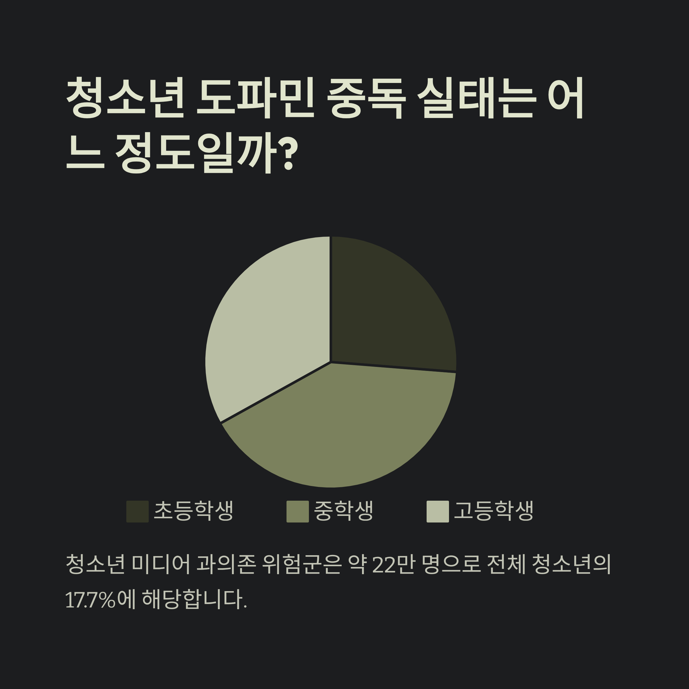 특히 중학생의 경우 10명 중 4명이 디지털 중독 위험에 놓여 있는 상황입니다.
